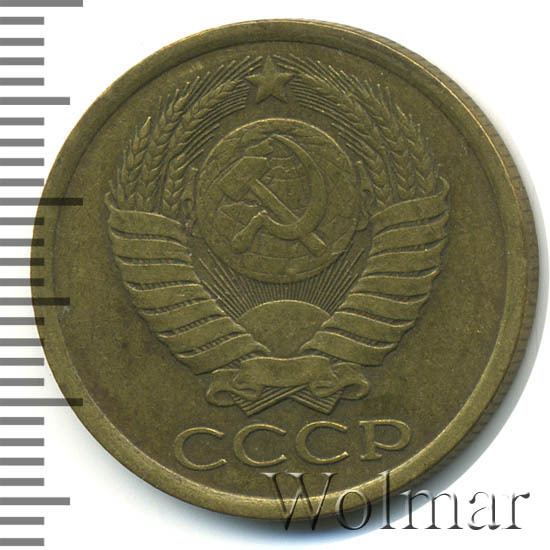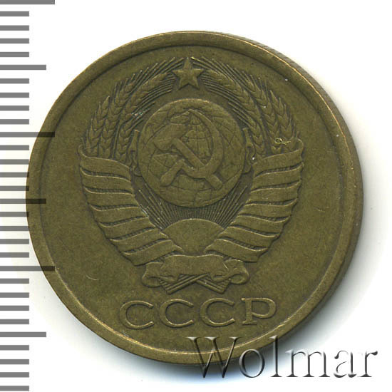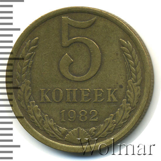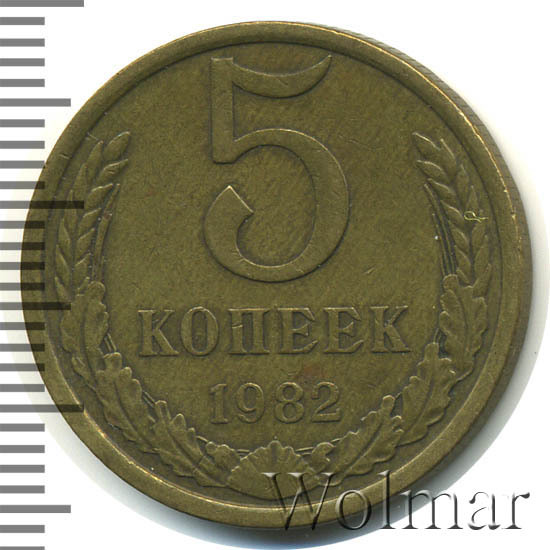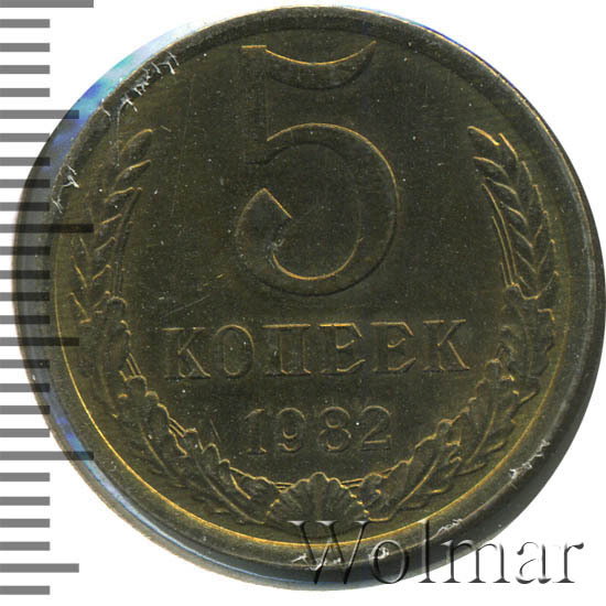 Рядовая, тиражная монета Советского Союза. Тип дизайна 1961 – 1991 годов. 5 копеек 1982 г. - одна из 9 номиналов монет регулярной чеканки. Отношение аверса к реверсу медальное. Материал чеканки: медно – цинковый сплав, желтого цвета. Данные о тираже не известны. Чеканились пять копеек 1982 года как для оборота так и, улучшенного качества, для годовых наборов Государственного Банка. Разновидностей нет. Цена на монетку не очень велика, даже в коллекционном состоянии UNC. Эта монета часто встречается в копилках и россыпях погодовки советского периода, что в первую очередь связано с очень большим тиражом данных монет. Присутствует в коллекции даже у начинающих нумизматов.