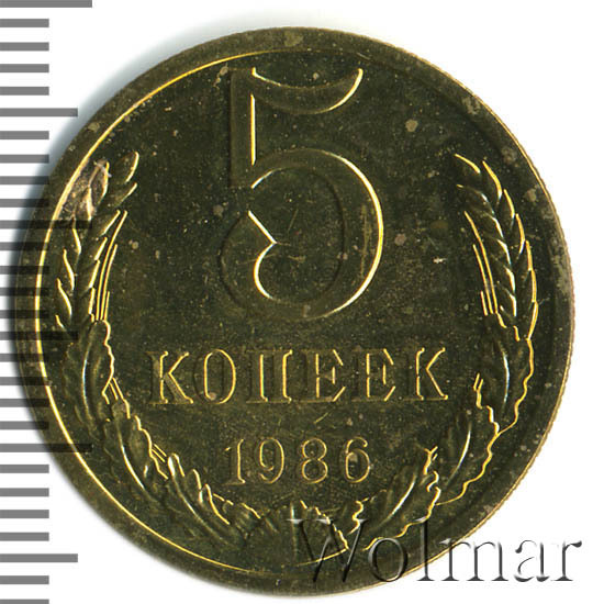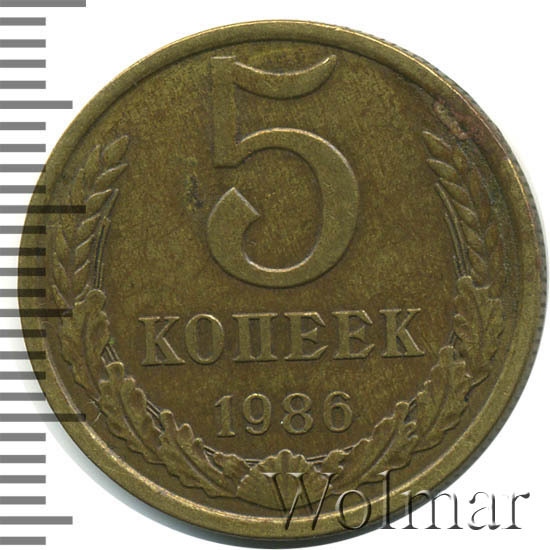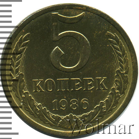 Монета номиналом в 5 копеек 1986 г. была выпущена в денежное обращение СССР в год, объявленный ООН, Годом Мира. Тип дизайна латунных монет 1961 – 1991 годов. 5 копеек 1986 чеканились как для оборота так и, улучшенного качества, для годовых наборов Государственного Банка СССР. Из-за большого тиража, цена на пять копеек 1986 не велика, даже в отличном состоянии. Это относится и к наборным монетам. Известных разновидностей нет. В тот год, на Ленинградском монетном дворе, были отчеканены две памятные монеты номиналом в 1 рубль посвященные: Году Мира и 275 летию со дня рождения великого русского учёного М.В. Ломоносова . Если 5 копеек 1986 г. в Вашей коллекции не в идеальном состоянии, присмотреть ей замену, Вы сможете, посмотрев вкладку "стоимость монеты", где приведены статистические данные, построенные на основе прошедших аукционов. По ним Вы можете узнать актуальную в данный момент цену 5 копеек 1986 года в различной сохранности.