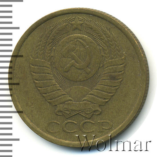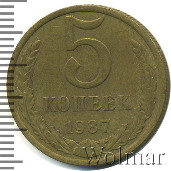 Рядовая монета. Один из девяти номиналов монет регулярной чеканки для денежного обращения Союза Советских Социалистических Республик. Тип дизайна 1961 – 1991 годов. 5 копеек 1987 чеканились как для оборота так и, улучшенного качества, для годовых наборов Государственного (с 1987 года – Центрального) Банка СССР. Разновидностей нет. Цена на монетку не очень велика, даже в коллекционном состоянии UNC. Чеканка производилась из медно – цинкового сплава, желтого цвета. Выпуск производился на двух монетных дворах, в Москве (ММД) и Ленинграде (ныне Санкт – Петербург) на ЛМД.