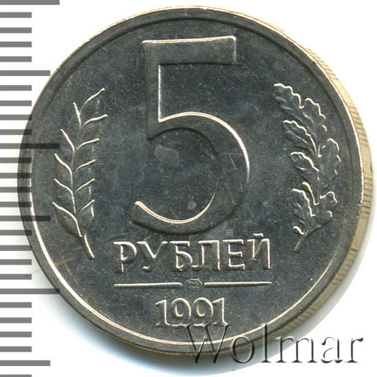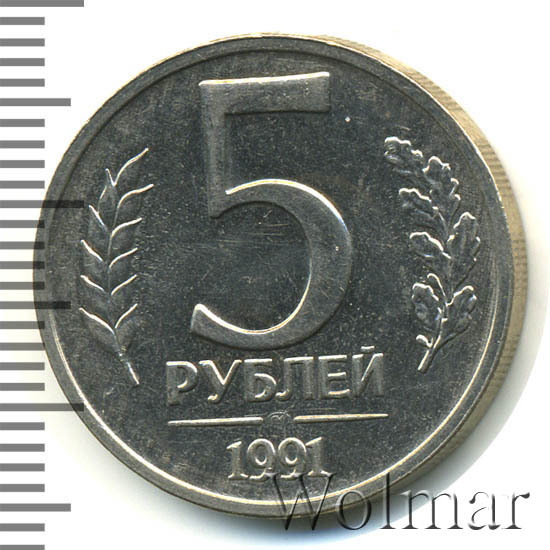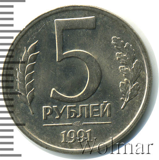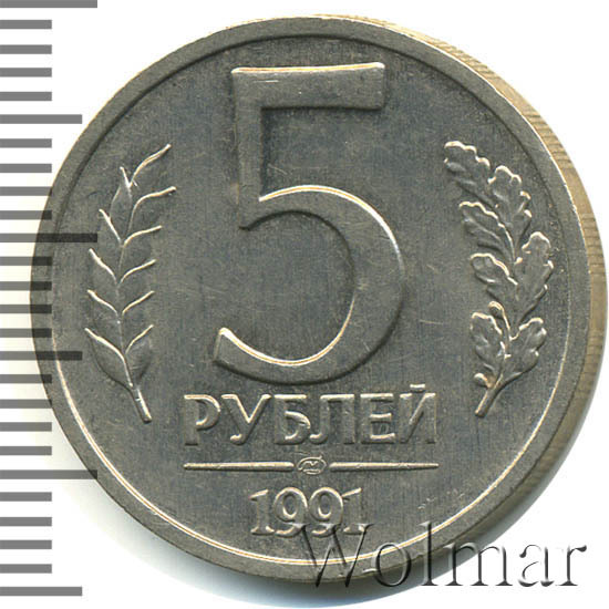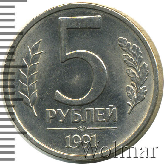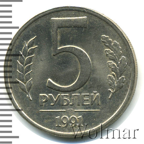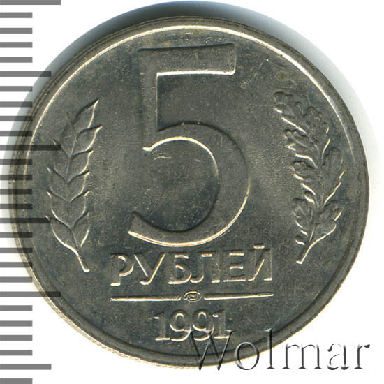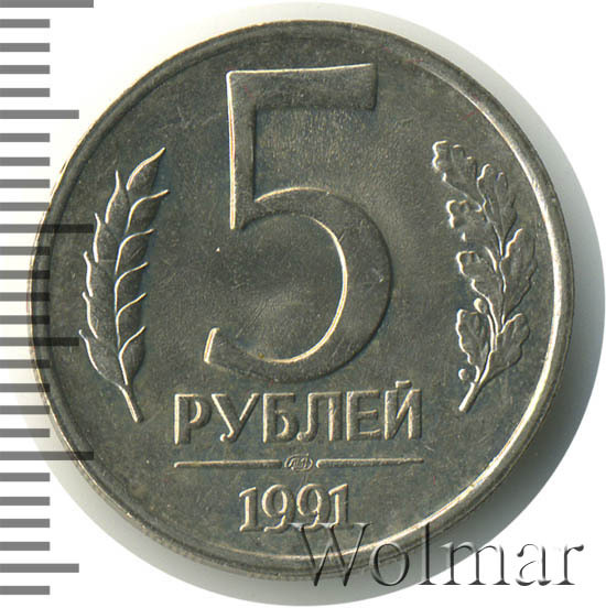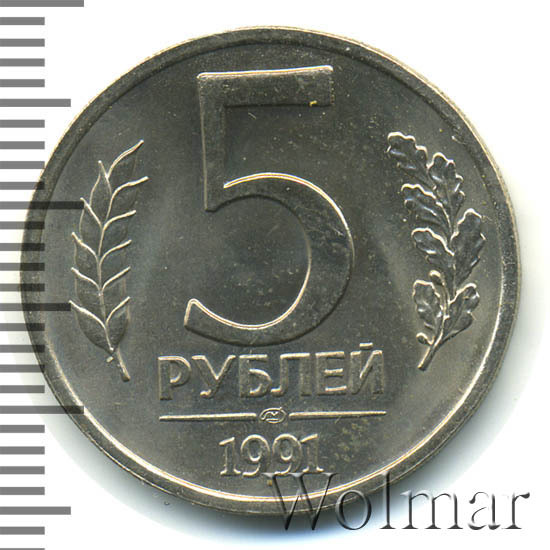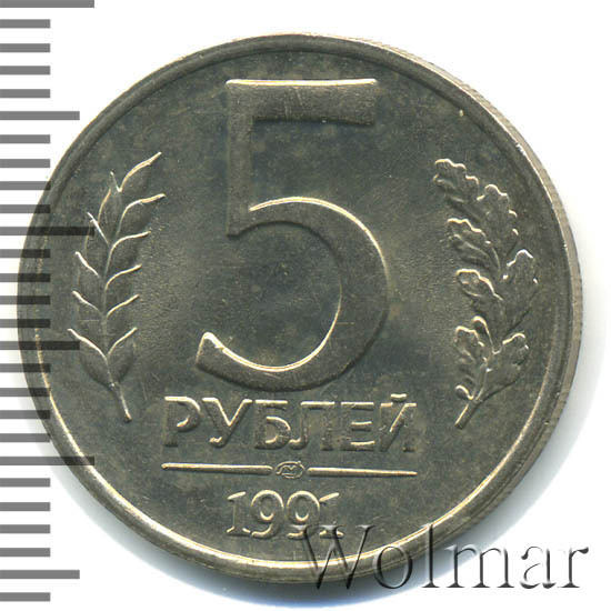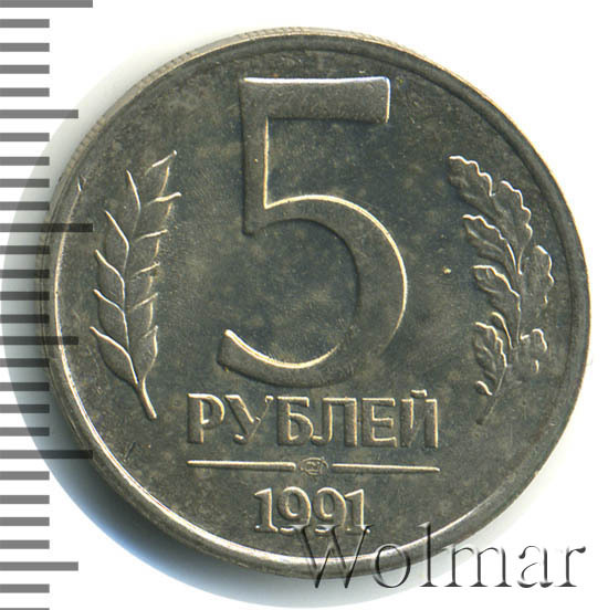 В центре немного смещенная вверх цифра «5» обозначающая номинал монеты, ниже слово «РУБЛЕЙ», под ним две горизонтальные заостренные черты смотрящие в разные стороны между ними монограмма монетного двора (ЛМД). Внизу у края монеты год выпуска «1991». Слева колос, справа дубовая ветвь.