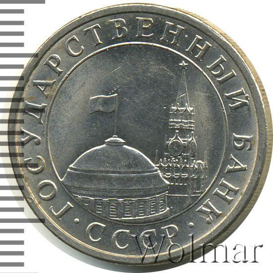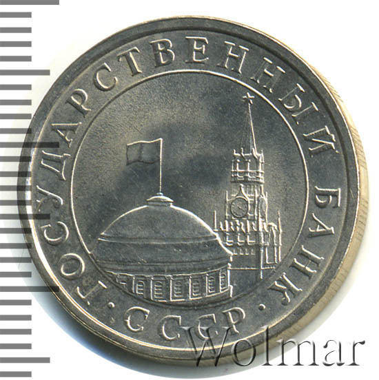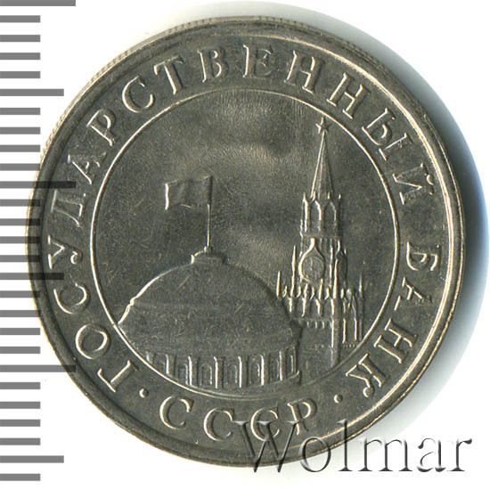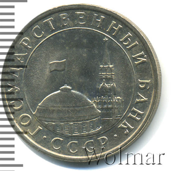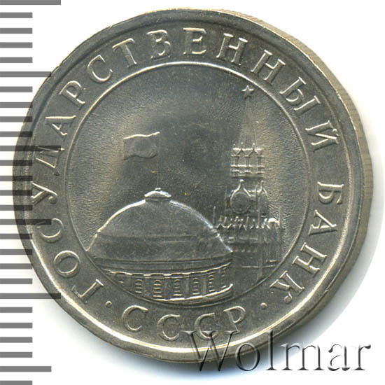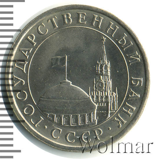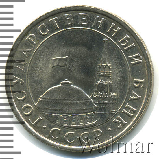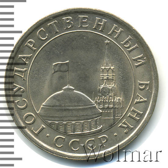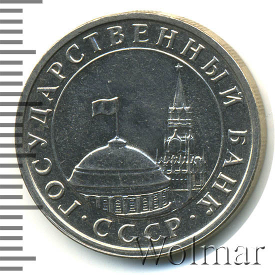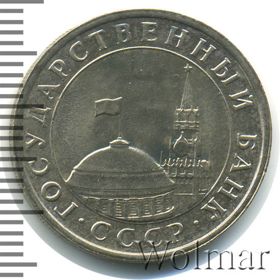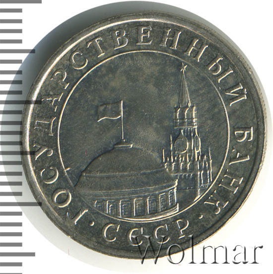 В центре немного смещенная вверх цифра «5» обозначающая номинал монеты, ниже слово «РУБЛЕЙ», под ним две горизонтальные заостренные черты смотрящие в разные стороны между ними монограмма монетного двора (ЛМД). Внизу у края монеты год выпуска «1991». Слева колос, справа дубовая ветвь.
