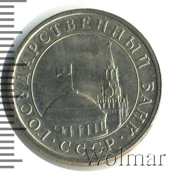 Вверху вдоль края монеты надпись «ГОСУДАРСТВЕННЫЙ БАНК», внизу буквы «СССР» с точками по краям, в середине изображение Спасской башни Московского Кремля и частично перекрывающего ее купола Сенатского дворца с развевающимся флагом.