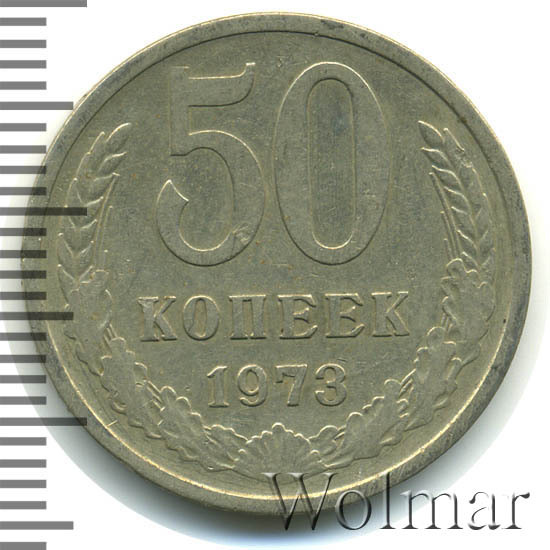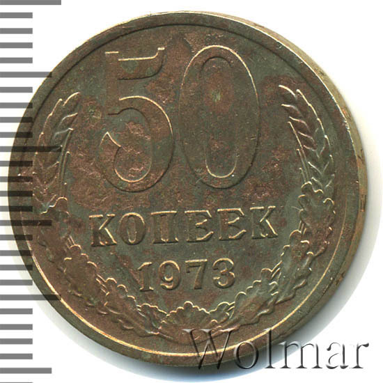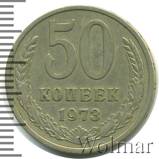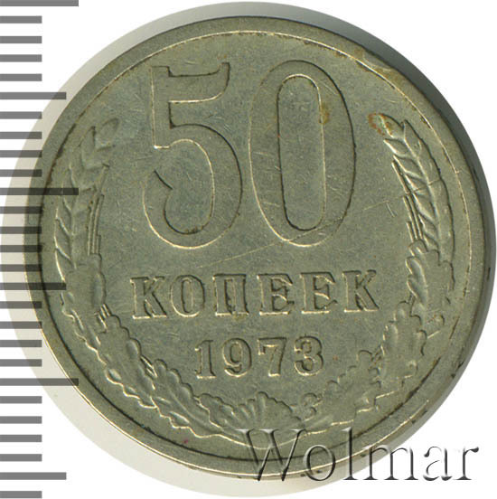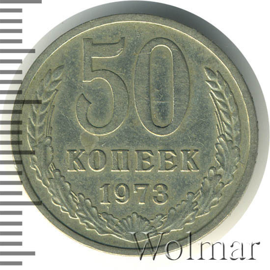 Монета 50 копеек 1973 года. Разменная монета Советского Союза. Была отчеканена в сплаве нейзильбер ( медно-никелевый сплав). Довольно не частая монета в погодовки Советского Союза, хотя ищется с небольшим трудом. Стоимость 50 копеек 1973 немного разнятся в зависимости от состояния, но даже в отличной сохранности UNC стоит весьма не дорого. Разновидностей у 50 копеек 1973 нет( см. описание аверса и реверса), в отличие от 3 копеек 1973 года. Такой тип монет чеканился с 1961 по 1991 года. Ниже приведены статистические данные, построенные на основе прошедших аукционов. По ним Вы можете узнать актуальную на данный момент стоимость 50 копеек 1973 года.