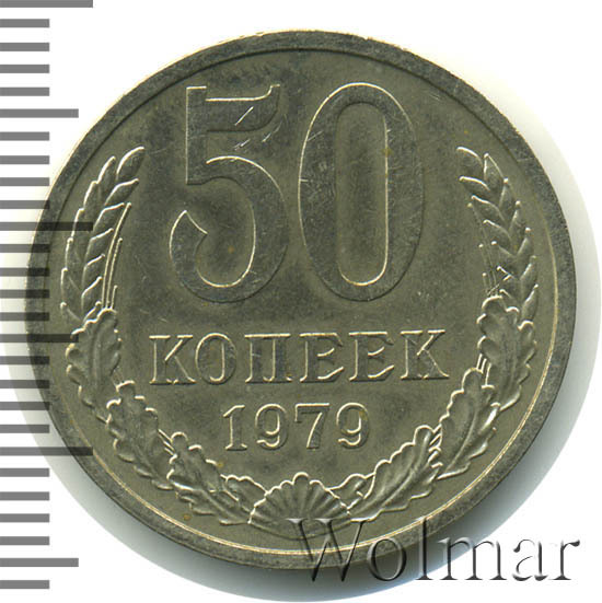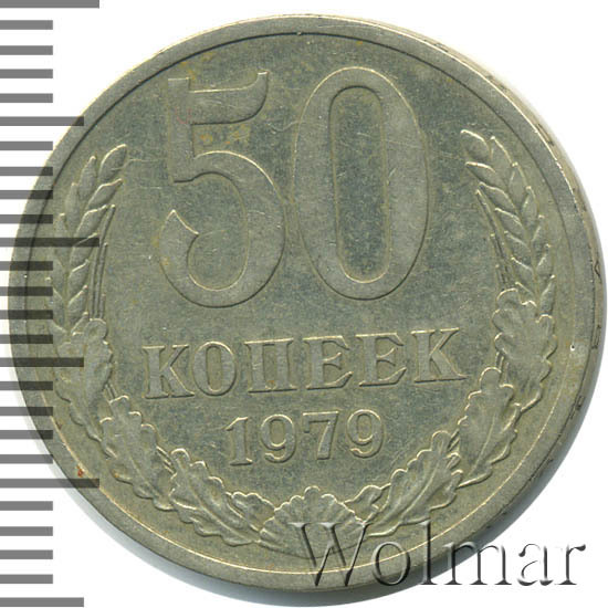 50 копеек 1979 - крупная немагнитная медно-никелевая монета выпускалась Госбанком СССР с 1961 по 1991 годы. Пятидесяти копеечные монеты, от мелочи меньших номиналов, отличаются наличием вдавленной гуртовой надписи "пятьдесят копеек" с датой текущего года выпуска. Стоимость полтинника 1979 года не большая и сравнима со стоимостью других 50 копеечных монет соседних не редких годов. Коллекционерам известна более дорогая штемпельная разновидность 50 копеек 1979 с плоским земным шаром и маленькой звездой, венчающей государственный герб. Стоимость такой монетки оценивают примерно в 50-60 раз дороже, нежели стоимость обычного полтинника, с выпуклым земным шаром и большой звездой.