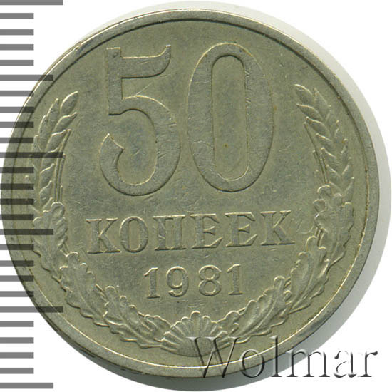 Цена 50 копеек 1981 года не высокая и сравнима со стоимостью аналогичных медно - никелевых пятидесяти копеечников с большими объёмами выпусков. Для монет в отличной сохранности (без следов обращения), цена возрастает в несколько раз. Подробно ознакомиться со стоимостью 50 копеек 1981 года, Вы можете во вкладке «стоимость монет», а так же принять участие в текущих аукционах, пройдя по вкладке «активные лоты».