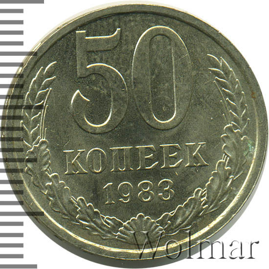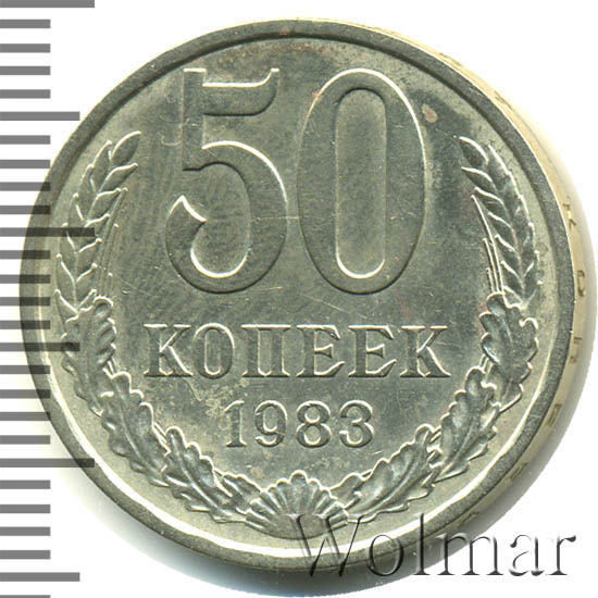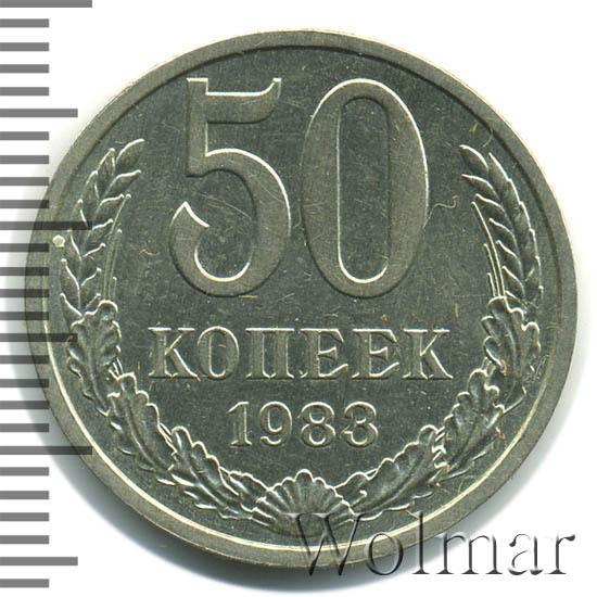 50 копеек 1983 г. - тиражная монета с традиционным оформлением для монет этого номинала с 1961 по 1991 годы. Отчеканена, как и все номиналы восемьдесят третьего года, на Ленинградском монетном дворе (сейчас СПМД). Чеканка велась из немагнитного сплава меди с никелем, белого цвета. Тираж доподлинно не известен по сегодняшний день. Штемпельных разновидностей нет (см. описание аверса и реверса), в отличие от 20 коп. этого года. Отношение лицевой стороны к оборотной – медальное.