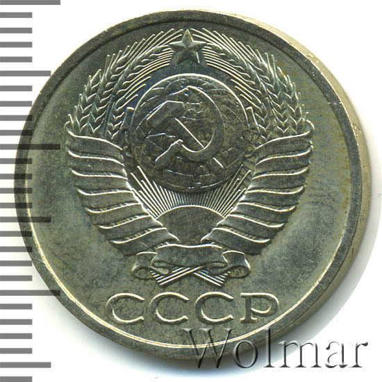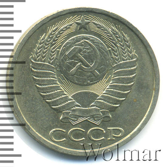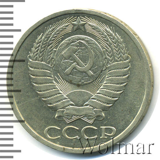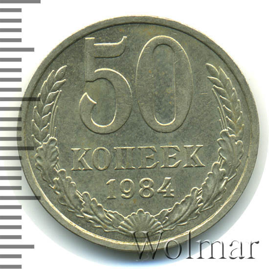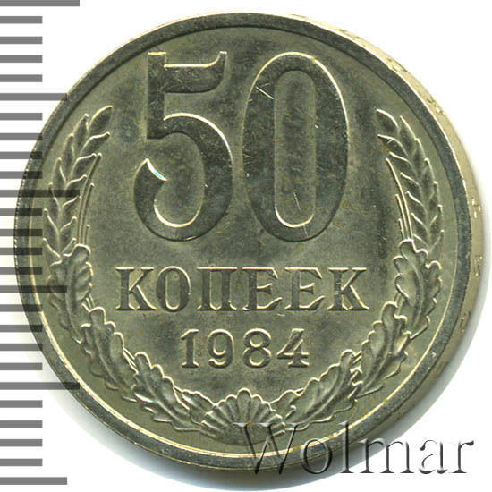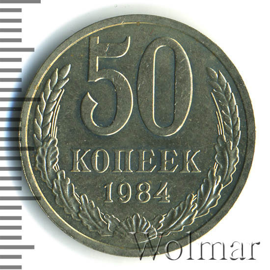 50 копеек - вторая по величине номинала и размеру монета в линейке советской тиражной мелочи. Чеканилась из медно-никелевого немагнитного сплава белого цвета. Полтинники отличаются приятной для коллекционеров особенностью в оформлении - вдавленной гуртовой надписью "пятьдесят копеек" с текущим годом выпуска монеты. Разновидностей и вариантов сочетания штемпелей, увы, нам не известно, а цена 50 копеек 1984 не велика и вполне обычна для советских полтинников, позднего СССР, выпущенных значительными объёмами.