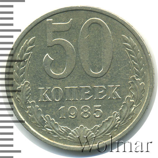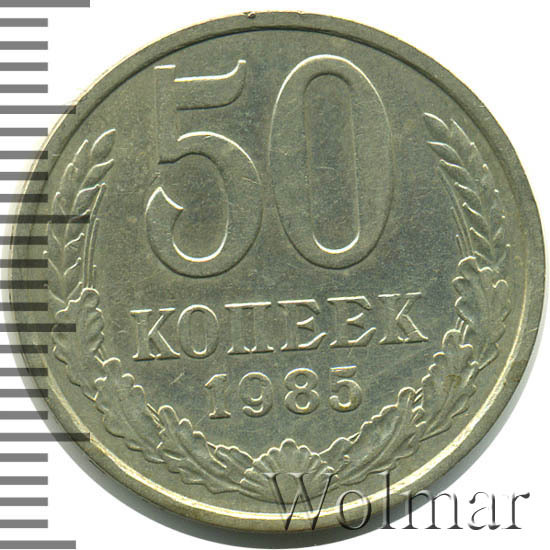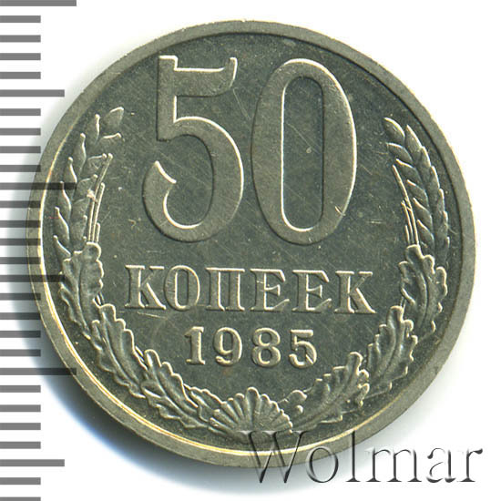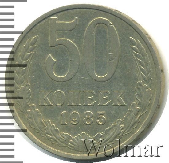 Пятьдесят копеек 1985 года, рядовая, разменная монета. Чеканилась на Ленинградском монетном дворе (сейчас СПМД, г. Санкт – Петербург) для денежного обращения Союза Советских Социалистических Республик. В восемьдесят пятом году прошлого столетия, было выпущено девять номиналов разменных монет (от копейки до 1 рубля) в разном качестве чеканки: для обращения (обычного) и, улучшенного, для годовых наборов Госбанка СССР. Соосность аверса к реверсу - медальная. Тип 1961 – 1991 гг. 50 коп. 1985 г. изготавливались из немагнитного медно – никелевого монетного сплава, белого цвета. Известных разновидностей нет. Точный тираж не известен.