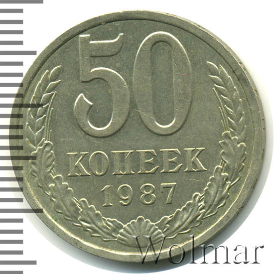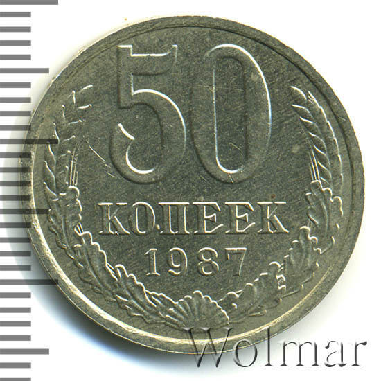 50 копеек 1987 г. - монета регулярного чекана СССР. Материал изготовления: немагнитный сплав нейзильбер (медно - никелевый), белого цвета. Тираж не известен. Соответствует типу 1961 – 1991 годов. Известных разновидностей нет (см. описание аверса и реверса). Соостность – медальная. Чеканка велась на Ленинградском и Московском монетных дворах, по двум технологиям: для обращения и, улучшенного, для годовых наборов Центрального Банка СССР. На ЛМД, к 70-ти летнему юбилею Великой Октябрьской Социалистической революции, была выпущена серия из трёх памятных монет, различного достоинства: один, три и пять рублей .
