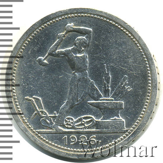 Герб изображён с семью витками ленты (по количеству союзных республик), поверхность земного шара выпуклая, слева и справа буквы СССР, под гербом поле разделено тонкой горизонтальной чертой, снизу надпись "ОДИН ПОЛТИННИК". Ниже элемент оформления - две прямые разделённые точкой. По кругу, между внешним точечным и внутренним линейным ободками - надпись - призыв "ПРОЛЕТАРИИ ВСЕХ СТРАН, СОЕДИНЯЙТЕСЬ!", запятая после слова "СТРАН" касается линейного ободка.