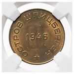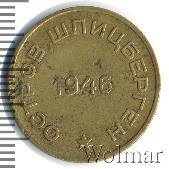 В центре указана дата выпуска - "1946". По окружности, вдоль канта, надпись: "ОСТРОВ ШПИЦБЕРГЕН". Внизу - пятиконечная звезда.