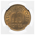 В центре крупно указан номинал - цифра "10". Под цифрой - слово "КОПЕЕК". Сверху полукругом, вдоль канта, надпись: "АРКТИКУГОЛЬ".