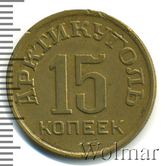 В центре крупно указан номинал - цифра "15". Под цифрой - слово "КОПЕЕК". Сверху полукругом, вдоль канта, надпись: "АРКТИКУГОЛЬ".