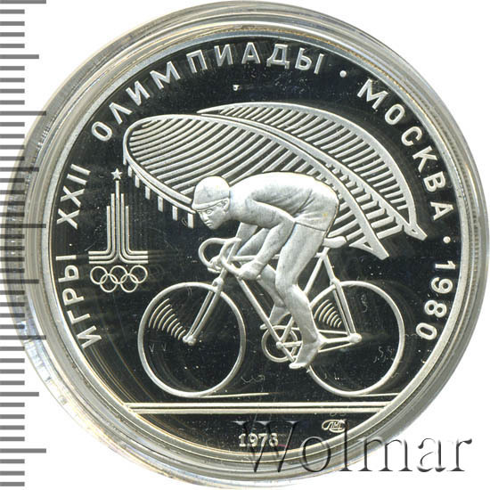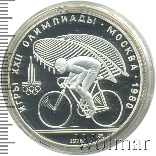 Слева и сверху вдоль канта слова «ИГРЫ XXII ОЛИМПИАДЫ», справа разделенные точкой слово «МОСКВА» и год проведения XXII Олимпиады «1980», слева эмблема XXII Олимпийских игр, в середине велосипедист, за ним велотрек в Крылатском, под велосипедистом справа монограмма монетного двора «ЛМД», внизу у канта год выпуска монеты «1978».