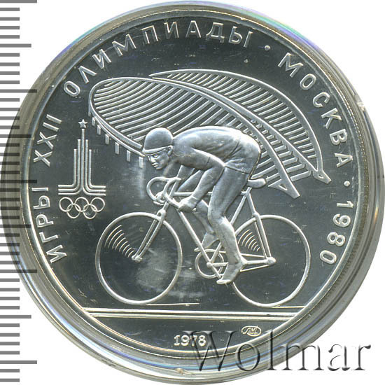Слева и сверху вдоль канта слова «ИГРЫ XXII ОЛИМПИАДЫ», справа разделенные точкой слово «МОСКВА» и год проведения XXII Олимпиады «1980», слева эмблема XXII Олимпийских игр, в середине велосипедист, за ним велотрек в Крылатском, под велосипедистом справа монограмма монетного двора «ЛМД», внизу у канта год выпуска монеты «1978».