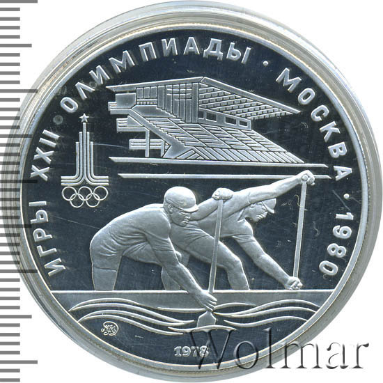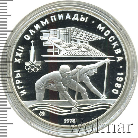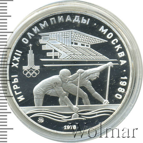 Слева и сверху вдоль канта слова «ИГРЫ XXII ОЛИМПИАДЫ», справа разделенные точкой слово «МОСКВА» и год проведения XXII Олимпиады «1980», слева эмблема XXII Олимпийских игр, в середине гребцы на каноэ, за ними сверху гребной канал в Крылатском, под каноэ слева монограмма монетного двора «ММД», внизу у канта год выпуска монеты «1978».