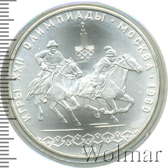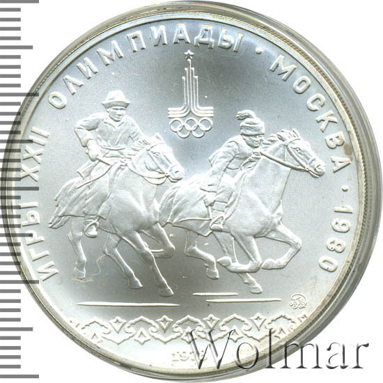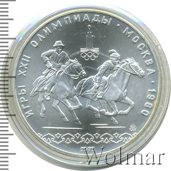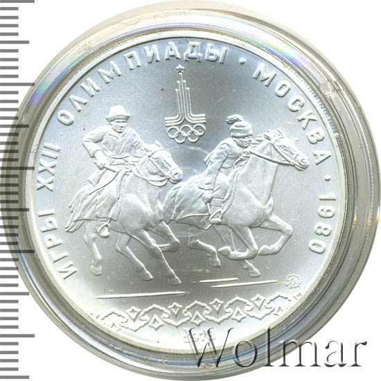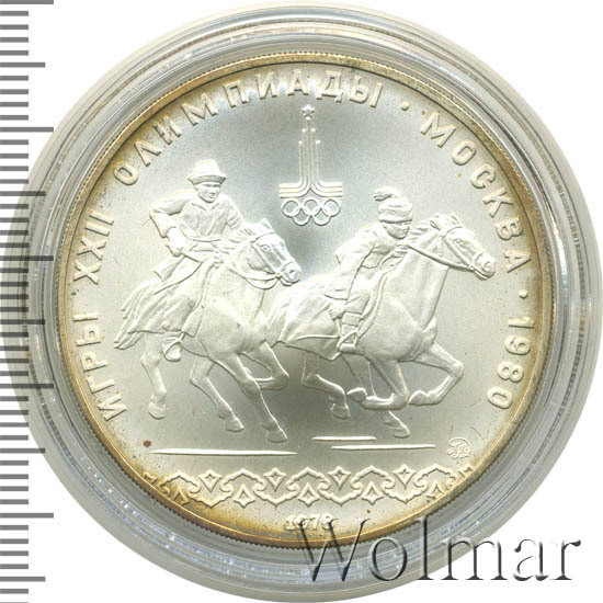 Слева и сверху вдоль канта слова «ИГРЫ XXII ОЛИМПИАДЫ», справа разделенные точкой слово «МОСКВА» и год проведения XXII Олимпиады «1980», сверху эмблема XXII Олимпийских игр, в середине всадник гонится за всадницей, под ними справа монограмма монетного двора «ММД», ниже орнамент, внизу у канта год выпуска монеты «1978».