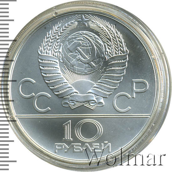 Сверху герб СССР с 15 витками ленты, слева от него буквы «СС», справа «СР», ниже двойная черта, под ней обозначение достоинства монеты цифра «10» и ниже слово «РУБЛЕЙ».