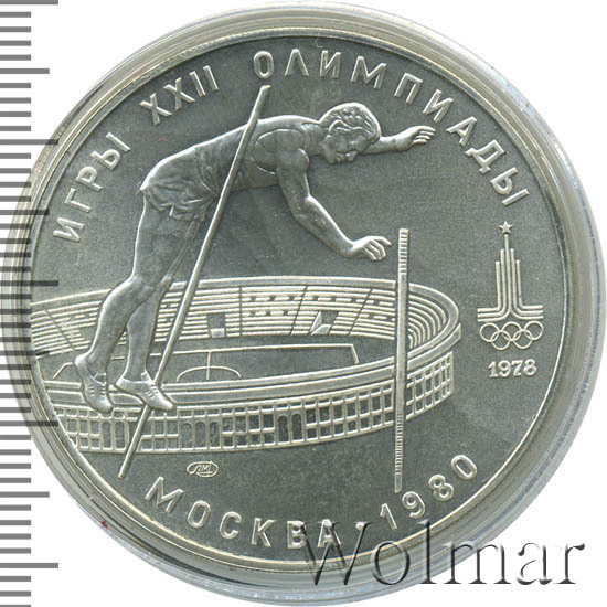 Сверху вдоль канта слова «ИГРЫ XXII ОЛИМПИАДЫ», ниже справа эмблема XXII Олимпийских игр и под ней год выпуска монеты «1978», в середине прыгун с шестом преодолевающий высоту, за ним стадион им. В.И. Ленина (Лужники), под стадионом монограмма монетного двора «ММД», внизу у края монеты разделенные точкой слово «МОСКВА» и год проведения XXII Олимпиады «1980».