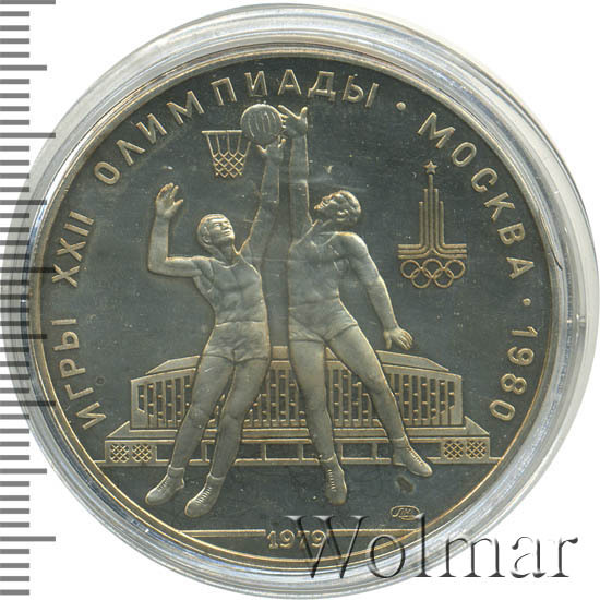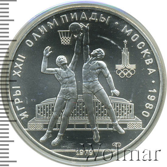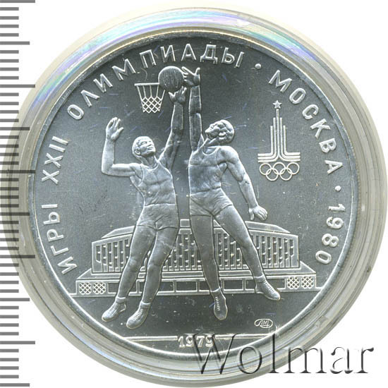 Слева и сверху вдоль канта слова «ИГРЫ XXII ОЛИМПИАДЫ», справа разделенные точкой слово «МОСКВА» и год проведения XXII Олимпиады «1980», в середине два баскетболиста, один атакует, второй защищает баскетбольное кольцо, за ними универсальный спортивный комплекс, где проводились игры по баскетболу, справа сверху эмблема XXII Олимпийских игр, справа снизу монограмма монетного двора «ЛМД», внизу у канта год выпуска монеты «1979».