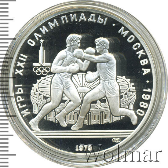 Слева и сверху вдоль канта слова «ИГРЫ XXII ОЛИМПИАДЫ», справа разделенные точкой слово «МОСКВА» и год проведения XXII Олимпиады «1980», сверху эмблема XXII Олимпийских игр, в середине поединок боксеров, за ними спортивное сооружение, где проводились соревнования по боксу, справа снизу монограмма монетного двора «ЛМД», внизу у канта год выпуска монеты «1979».