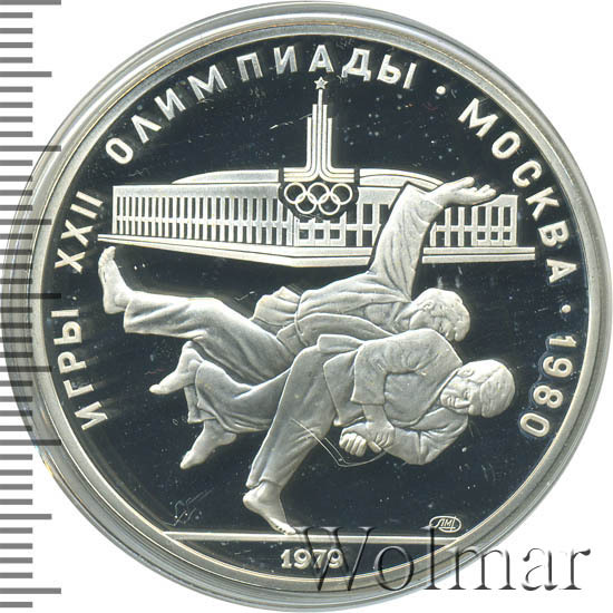 Слева и сверху вдоль канта слова «ИГРЫ XXII ОЛИМПИАДЫ», справа разделенные точкой слово «МОСКВА» и год проведения XXII Олимпиады «1980», сверху эмблема XXII Олимпийских игр, в середине поединок дзюдоистов, за ними спортивное сооружение, где проводились соревнования по дзюдо, справа снизу монограмма монетного двора «ММД», внизу у канта год выпуска монеты «1979».