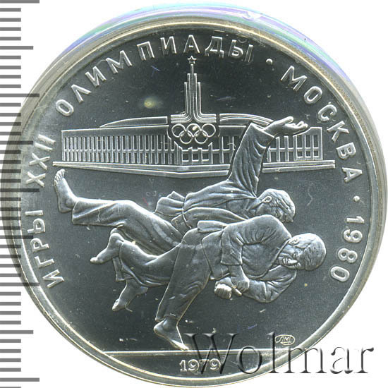 Слева и сверху вдоль канта слова «ИГРЫ XXII ОЛИМПИАДЫ», справа разделенные точкой слово «МОСКВА» и год проведения XXII Олимпиады «1980», сверху эмблема XXII Олимпийских игр, в середине поединок дзюдоистов, за ними спортивное сооружение, где проводились соревнования по дзюдо, справа снизу монограмма монетного двора «ММД», внизу у канта год выпуска монеты «1979».