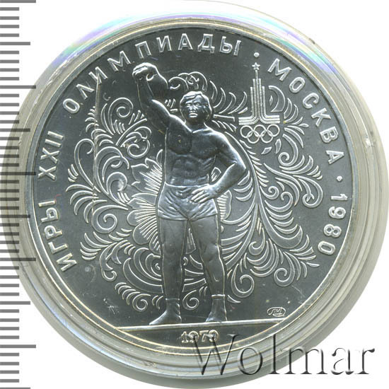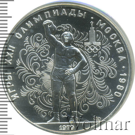 Слева и сверху вдоль канта слова «ИГРЫ XXII ОЛИМПИАДЫ», справа разделенные точкой слово «МОСКВА» и год проведения XXII Олимпиады «1980», сверху справа эмблема XXII Олимпийских игр, в середине на фоне узорчатого орнамента атлет, поднимающий гирю, справа снизу монограмма монетного двора «ЛМД», внизу у канта год выпуска монеты «1979».