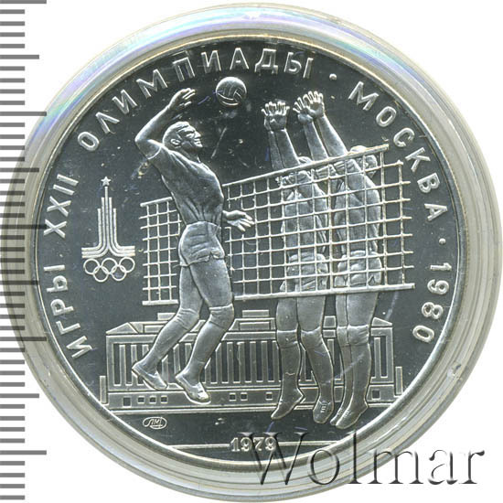 Слева и сверху вдоль канта слова «ИГРЫ XXII ОЛИМПИАДЫ», справа разделенные точкой слово «МОСКВА» и год проведения XXII Олимпиады «1980», в середине момент игры в волейбол, один волейболист проводит нападающий удар, два других ставят ему блок, за ними универсальный спортивный комплекс, где проводились игры по волейболу, слева сверху эмблема XXII Олимпийских игр, слева снизу монограмма монетного двора «ЛМД», внизу у канта год выпуска монеты «1979».