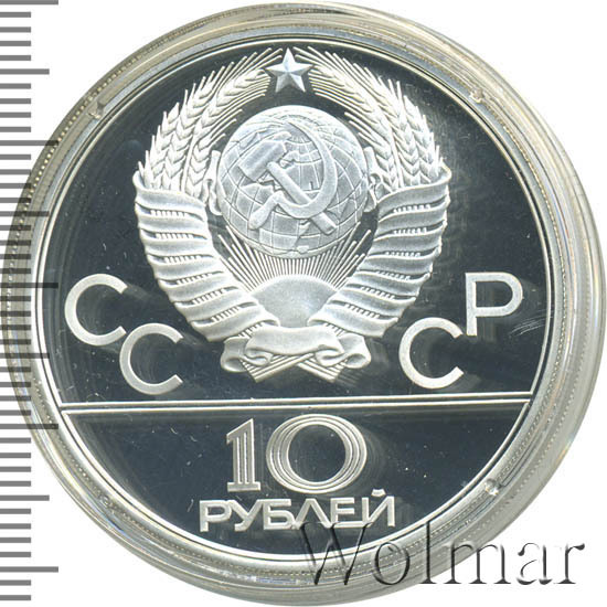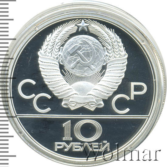 Сверху герб СССР с 15 витками ленты, слева от него буквы «СС», справа «СР», ниже двойная черта, под ней обозначение достоинства монеты цифра «10» и ниже слово «РУБЛЕЙ».
