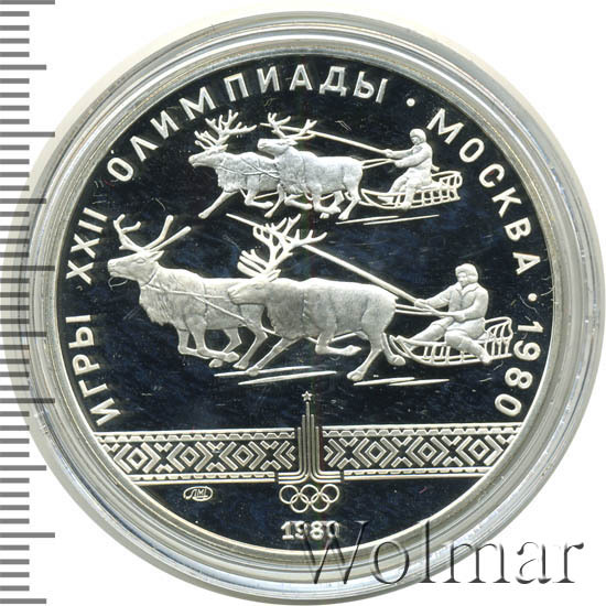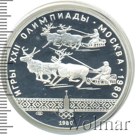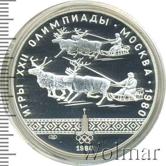 Слева и сверху вдоль канта слова «ИГРЫ XXII ОЛИМПИАДЫ», справа разделенные точкой слово «МОСКВА» и год проведения XXII Олимпиады «1980», в середине две оленьи упряжки соревнуются в гонке, ниже узорчатая полоса и в ее середине эмблема XXII Олимпийских игр, ниже слева монограмма монетного двора «ЛМД», внизу у канта в центре год выпуска монеты «1980».