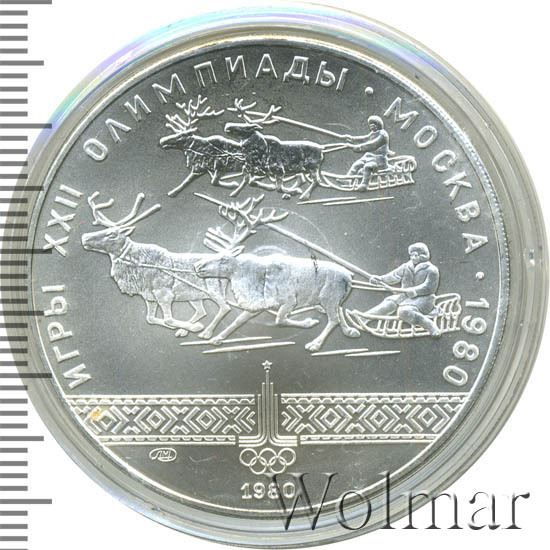 Слева и сверху вдоль канта слова «ИГРЫ XXII ОЛИМПИАДЫ», справа разделенные точкой слово «МОСКВА» и год проведения XXII Олимпиады «1980», в середине две оленьи упряжки соревнуются в гонке, ниже узорчатая полоса и в ее середине эмблема XXII Олимпийских игр, ниже слева монограмма монетного двора «ЛМД», внизу у канта в центре год выпуска монеты «1980».