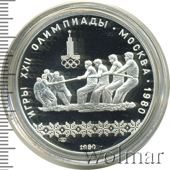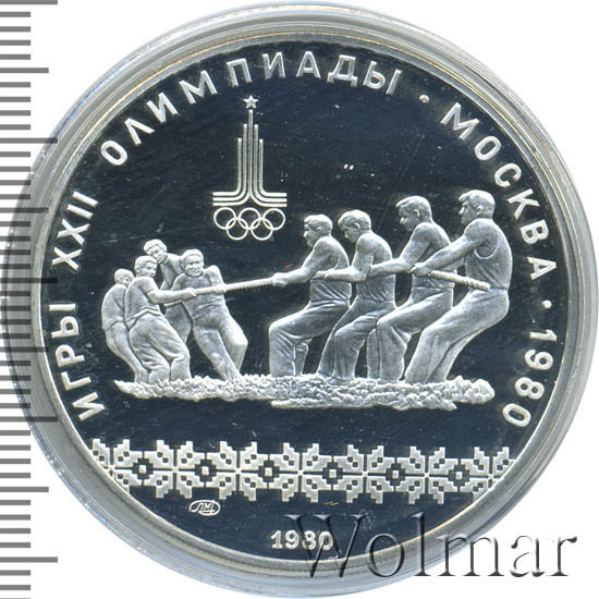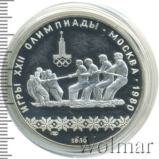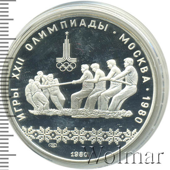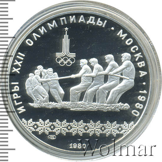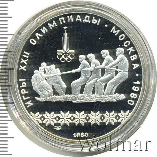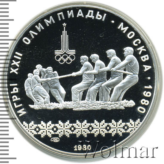 Слева и сверху вдоль канта слова «ИГРЫ XXII ОЛИМПИАДЫ», справа разделенные точкой слово «МОСКВА» и год проведения XXII Олимпиады «1980», ниже смещенная влево эмблема XXII Олимпийских игр, в середине две команды по четыре человека перетягивают канат, под ними узорчатый орнамент, ниже слева монограмма монетного двора «ЛМД», внизу у канта год выпуска монеты «1980».
