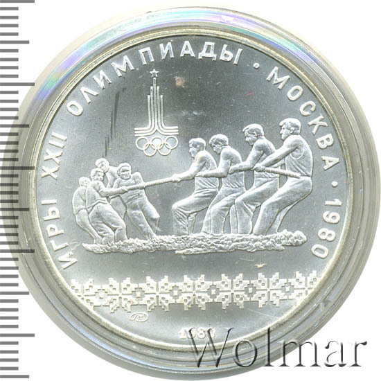 Слева и сверху вдоль канта слова «ИГРЫ XXII ОЛИМПИАДЫ», справа разделенные точкой слово «МОСКВА» и год проведения XXII Олимпиады «1980», ниже смещенная влево эмблема XXII Олимпийских игр, в середине две команды по четыре человека перетягивают канат, под ними узорчатый орнамент, ниже слева монограмма монетного двора «ЛМД», внизу у канта год выпуска монеты «1980».
