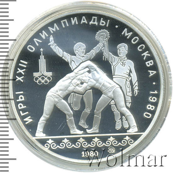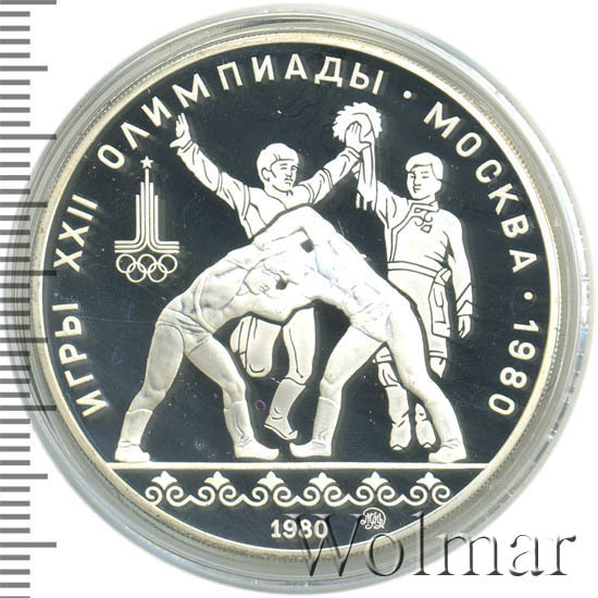 Слева и сверху вдоль канта слова «ИГРЫ XXII ОЛИМПИАДЫ», справа разделенные точкой слово «МОСКВА» и год проведения XXII Олимпиады «1980», в середине группа людей, танцующих танец Орла и Хуреш, слева эмблема XXII Олимпийских игр, внизу у канта в центре год выпуска монеты «1980», справа монограмма монетного двора «ММД».