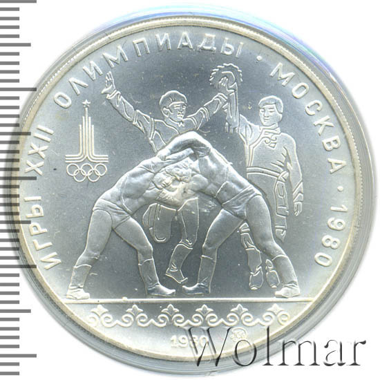 Слева и сверху вдоль канта слова «ИГРЫ XXII ОЛИМПИАДЫ», справа разделенные точкой слово «МОСКВА» и год проведения XXII Олимпиады «1980», в середине группа людей, танцуюших танец Орла и Хуреш, слева эмблема XXII Олимпийских игр, внизу у канта в центре год выпуска монеты «1980», справа монограмма монетного двора «ММД».
