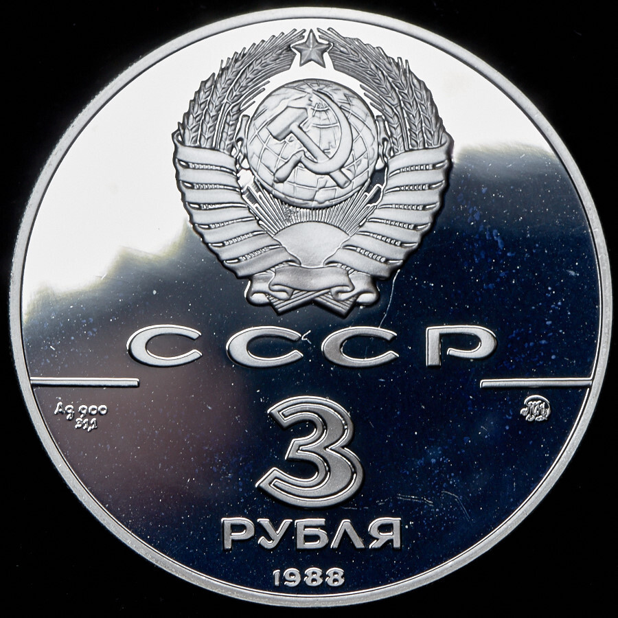 Сверху герб СССР с 15 витками ленты, под ним буквы «СССР», ниже слева и справа черта, под чертой слева химическое обозначение «Ag» и проба «900» металла из которого сделана монета, под ними чистый вес драгоценного металла «31,1», под чертой справа монограмма монетного двора «ММД», ниже обозначение достоинства монеты цифра «3» и ниже слово «РУБЛЯ», внизу у канта год выпуска монеты «1988».
