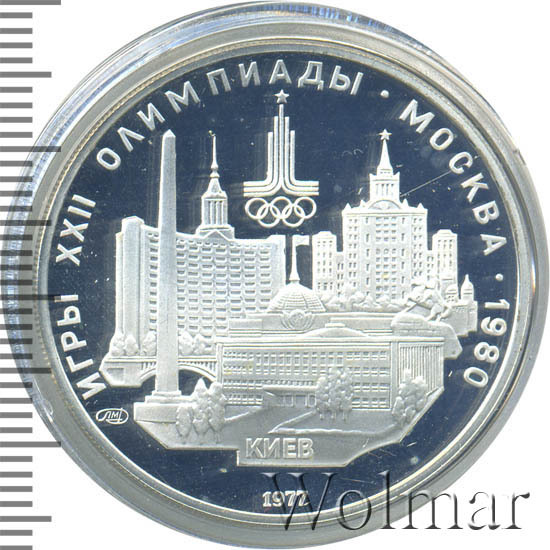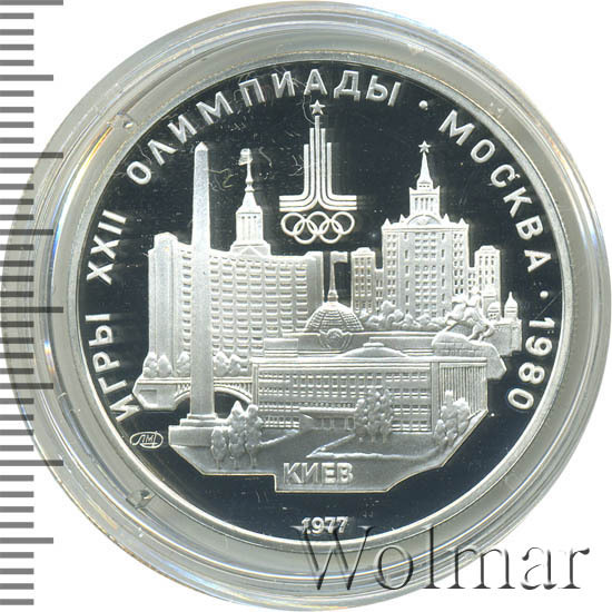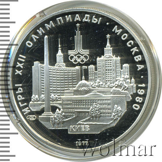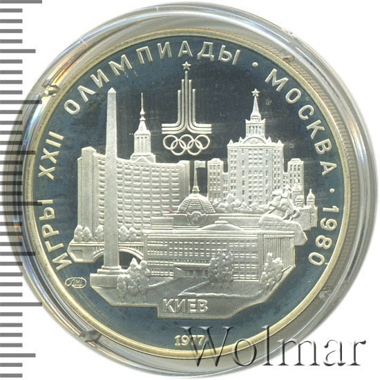 Слева и сверху вдоль канта слова «ИГРЫ XXII ОЛИМПИАДЫ», справа разделенные точкой слово «МОСКВА» и год проведения XXII Олимпиады «1980», вверху эмблема XXII Олимпийских игр, в середине панорама Киева, под ней слева монограмма монетного двора «ЛМД», внизу у канта год выпуска монеты «1977».
