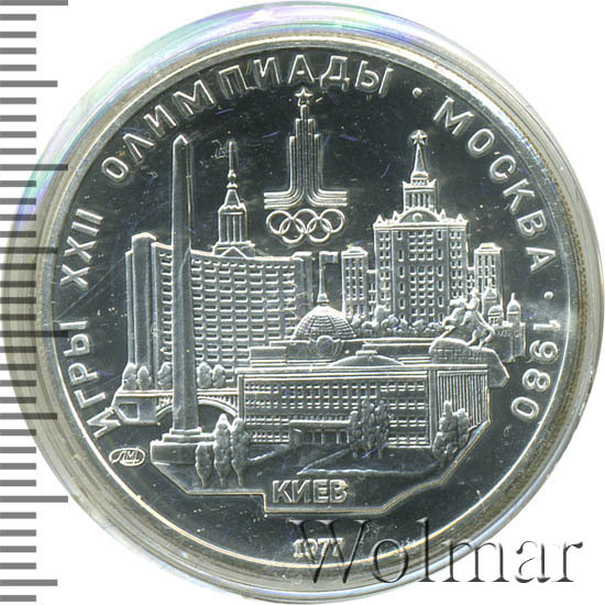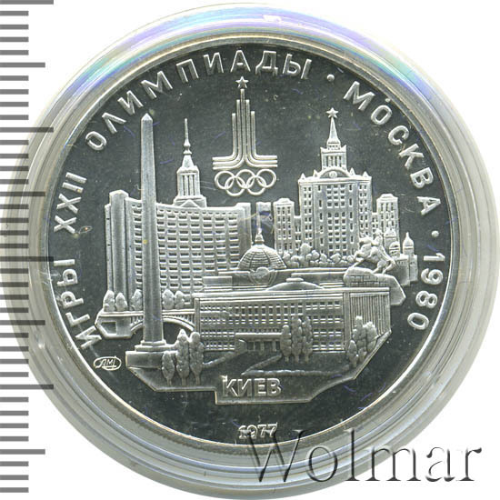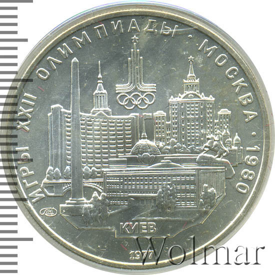 Слева и сверху вдоль канта слова «ИГРЫ XXII ОЛИМПИАДЫ», справа разделенные точкой слово «МОСКВА» и год проведения XXII Олимпиады «1980», вверху эмблема XXII Олимпийских игр, в середине панорама Киева, под ней слева монограмма монетного двора «ЛМД», внизу у канта год выпуска монеты «1977».