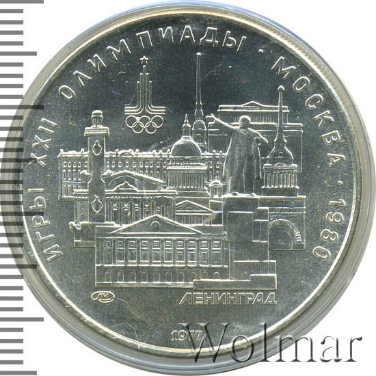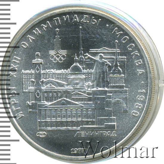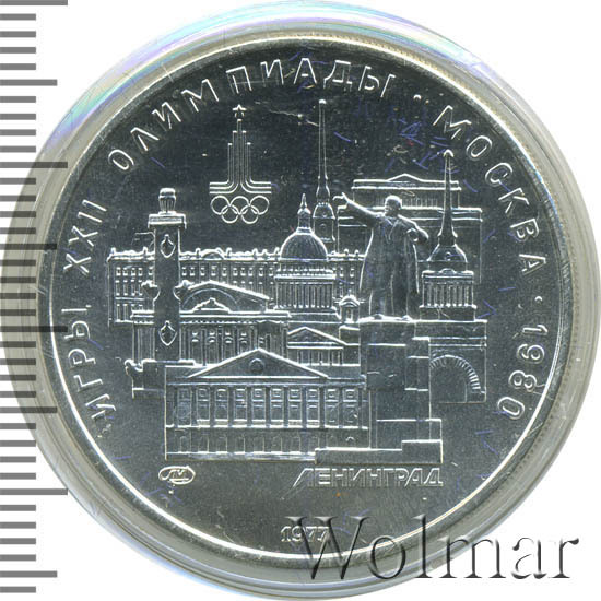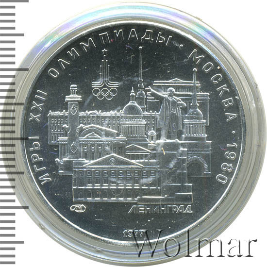Слева и сверху вдоль канта слова «ИГРЫ XXII ОЛИМПИАДЫ», справа разделенные точкой слово «МОСКВА» и год проведения XXII Олимпиады «1980», вверху слева эмблема XXII Олимпийских игр, в середине панорама Ленинграда, под ней слева монограмма монетного двора «ЛМД», внизу у канта год выпуска монеты «1977».