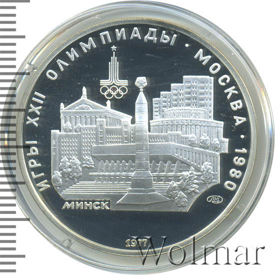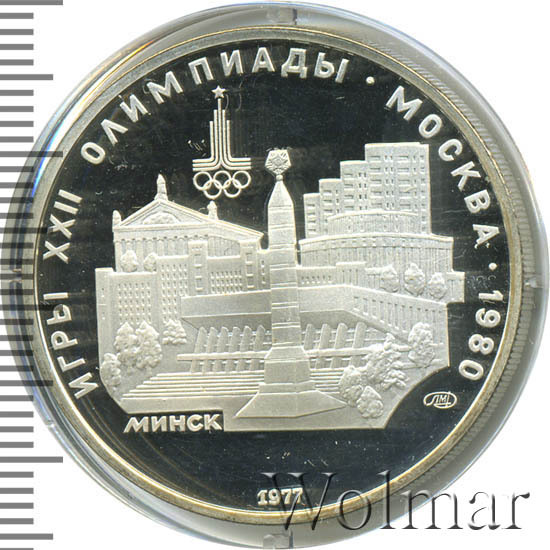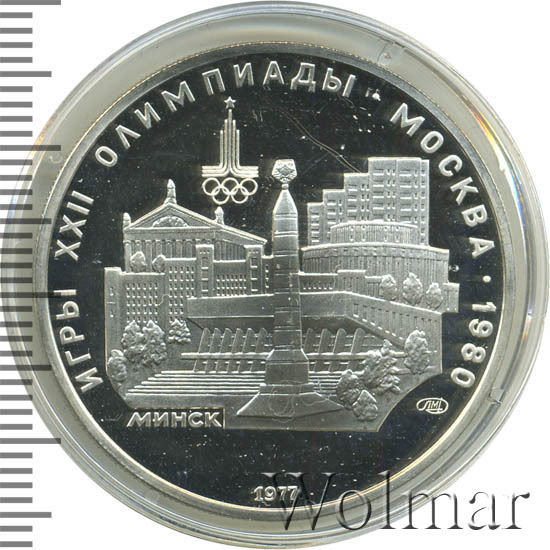 Слева и сверху вдоль канта слова «ИГРЫ XXII ОЛИМПИАДЫ», справа разделенные точкой слово «МОСКВА» и год проведения XXII Олимпиады «1980», вверху эмблема XXII Олимпийских игр, в середине панорама Минска, под ней справа монограмма монетного двора «ЛМД», внизу у канта год выпуска монеты «1977».