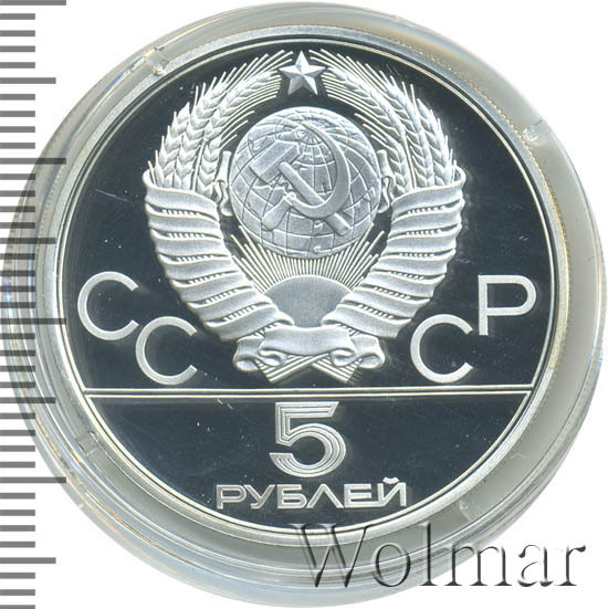 Сверху герб СССР с 15 витками ленты, слева от него буквы «СС», справа «СР», ниже двойная черта, под ней обозначение достоинства монеты цифра «5» и ниже слово «РУБЛЕЙ».
