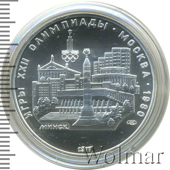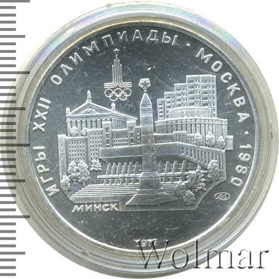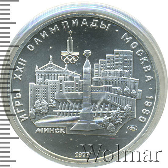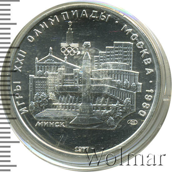 Слева и сверху вдоль канта слова «ИГРЫ XXII ОЛИМПИАДЫ», справа разделенные точкой слово «МОСКВА» и год проведения XXII Олимпиады «1980», вверху эмблема XXII Олимпийских игр, в середине панорама Минска, под ней справа монограмма монетного двора «ЛМД», внизу у канта год выпуска монеты «1977».