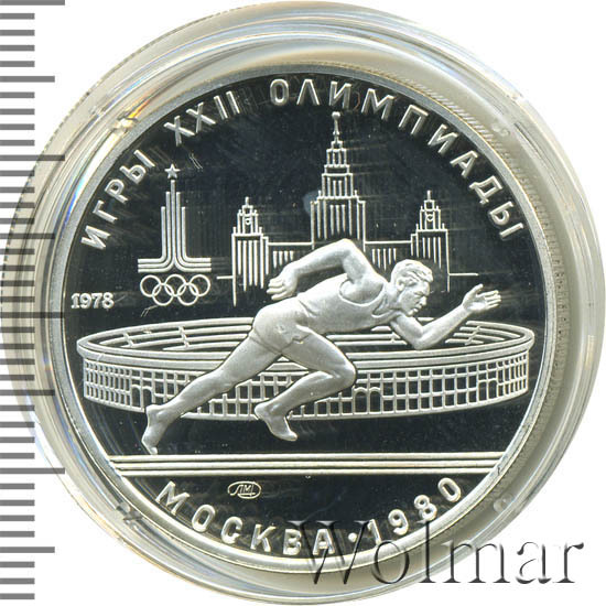 Сверху вдоль канта слова «ИГРЫ XXII ОЛИМПИАДЫ», ниже слева год выпуска монеты «1978» и эмблема XXII Олимпийских игр, в середине бегун и за ним стадион им. В.И. Ленина (Лужники), под бегуном смещенная влево монограмма монетного двора «ЛМД», внизу у края монеты разделенные точкой слово «МОСКВА» и год проведения XXII Олимпиады «1980».
