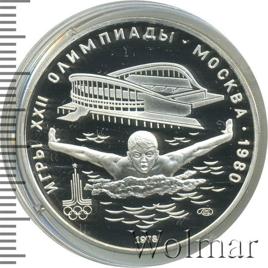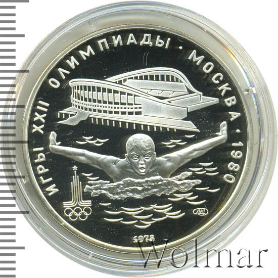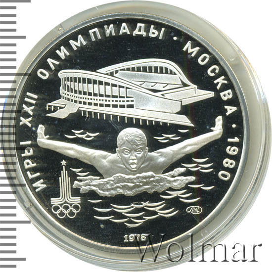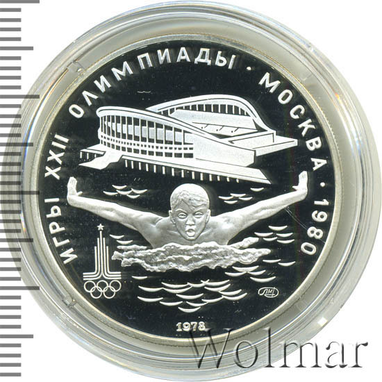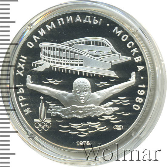 Слева и сверху вдоль канта слова «ИГРЫ XXII ОЛИМПИАДЫ», справа разделенные точкой слово «МОСКВА» и год проведения XXII Олимпиады «1980», сверху плавательный бассейн «Олимпийский», ниже пловец, под ним слева эмблема XXII Олимпийских игр, справа монограмма монетного двора «ЛМД», внизу у канта год выпуска монеты «1978».
