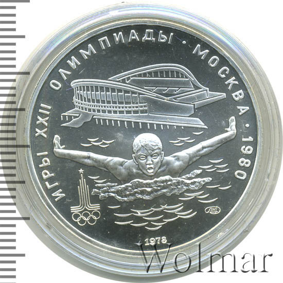 Слева и сверху вдоль канта слова «ИГРЫ XXII ОЛИМПИАДЫ», справа разделенные точкой слово «МОСКВА» и год проведения XXII Олимпиады «1980», сверху плавательный бассейн «Олимпийский», ниже пловец, под ним слева эмблема XXII Олимпийских игр, справа монограмма монетного двора «ЛМД», внизу у канта год выпуска монеты «1978».