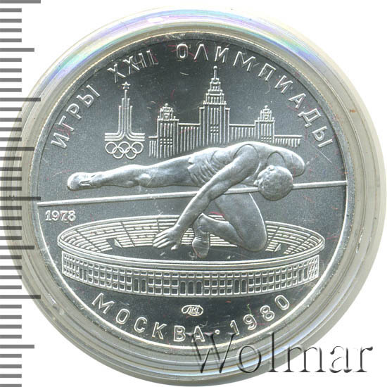 Сверху вдоль канта слова «ИГРЫ XXII ОЛИМПИАДЫ», ниже слева год выпуска монеты «1978» и эмблема XXII Олимпийских игр, в середине прыгун в высоту, за ним сверху здание МГУ им. Ломоносова, снизу стадион им. В.И. Ленина (Лужники), под стадионом монограмма монетного двора «ЛМД», внизу у края монеты разделенные точкой слово «МОСКВА» и год проведения XXII Олимпиады «1980».