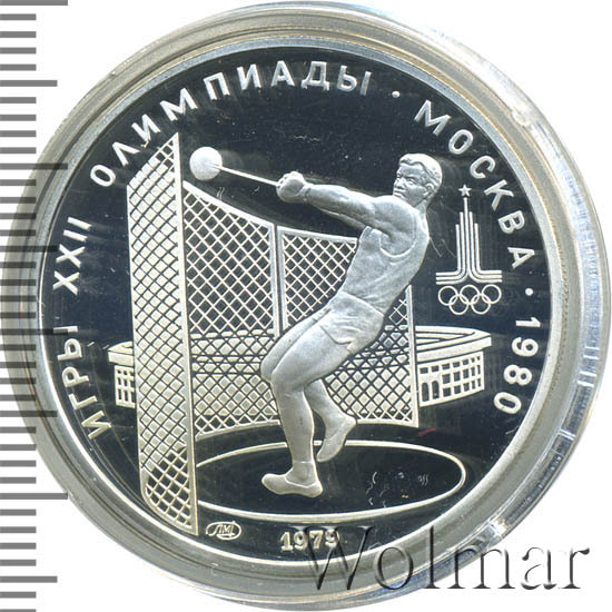 Слева и сверху вдоль канта слова «ИГРЫ XXII ОЛИМПИАДЫ», справа разделенные точкой слово «МОСКВА» и год проведения XXII Олимпиады «1980», в середине атлет в секторе для метания молота, за ним стадион им. В.И. Ленина (Лужники), справа эмблема XXII Олимпийских игр, внизу у канта слева монограмма монетного двора «ММД», справа год выпуска монеты «1979».