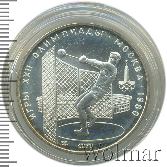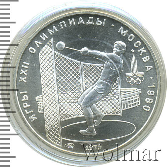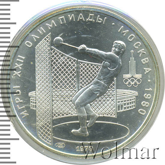 Слева и сверху вдоль канта слова «ИГРЫ XXII ОЛИМПИАДЫ», справа разделенные точкой слово «МОСКВА» и год проведения XXII Олимпиады «1980», в середине атлет в секторе для метания молота, за ним стадион им. В.И. Ленина (Лужники), справа эмблема XXII Олимпийских игр, внизу у канта слева монограмма монетного двора «ММД», справа год выпуска монеты «1979».