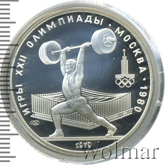 Слева и сверху вдоль канта слова «ИГРЫ XXII ОЛИМПИАДЫ», справа разделенные точкой слово «МОСКВА» и год проведения XXII Олимпиады «1980», в середине атлет, поднимающий штангу, за ним спортивный зал тяжелой атлетики, справа эмблема XXII Олимпийских игр, слева монограмма монетного двора «ММД», внизу у канта год выпуска монеты «1979».